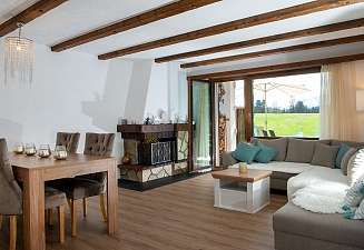 The ground-floor apartment features a cozy bedroom for restful nights, as well as a living area with a fireplace, dining table, and TV for your entertainment. To fully enjoy the breathtaking mountain views, a sunny terrace is at your disposal. The fully equipped kitchen includes a refrigerator, oven, and dishwasher, allowing you to prepare your favorite meals at any time.